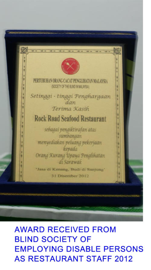 Rock Road Seafood Restaurant participates in community services in assisting the unfortunate groups (OKU) to improve their living standard. Rock Road Seafood Restaurant trained disabled persons as part of the restaurant employees to overcome their barrier towards working enviroment. Rock Road Seafood Restaurant received the award of appreciation on 2012 from The Society for The Blind Malaysia for helping the blind people in giving them opputunities to work like normal people.