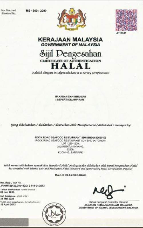 Rock Road Seafood Restaurant served & practised Halal standard of preparing dishes due to tremendously increase of muslim patronage over the time.With the assistance of Jabatan Agama Islam Sarawak, we have managed to receive our first Halal certification on 2008. Since then, patronage from various groups visit to our restaurant can never be less. Please refer to the latest Halal certification 2015 for further details.